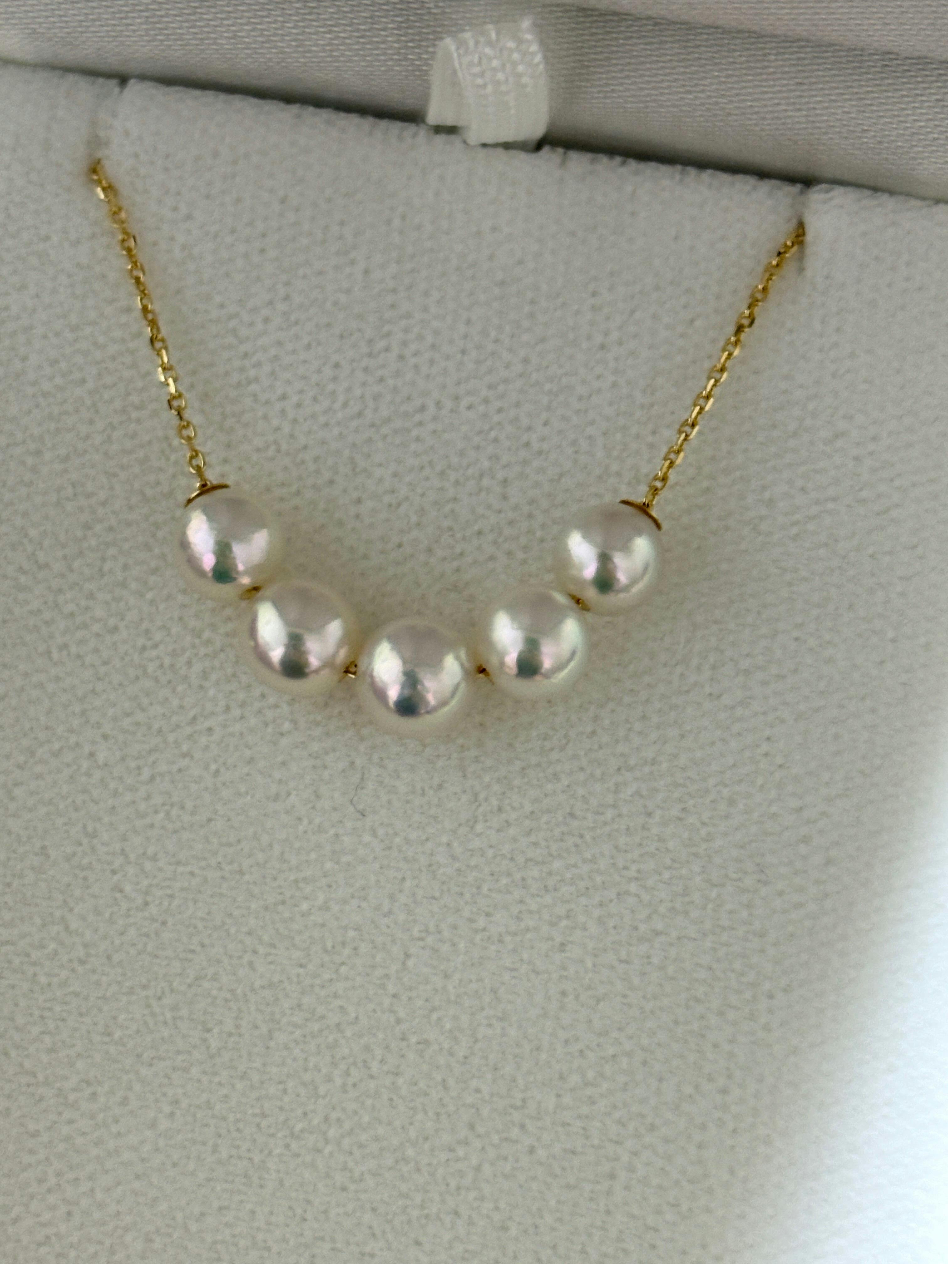 指輪と合わせて5粒珠も買ったのですが、テリと形が最高です。何より5粒の色の揃い方が素晴らしく、並大抵の選抜ではこの揃い方はしないと思います。どの角度から見ても全ての珠が同じように反射するところが脱帽です。
